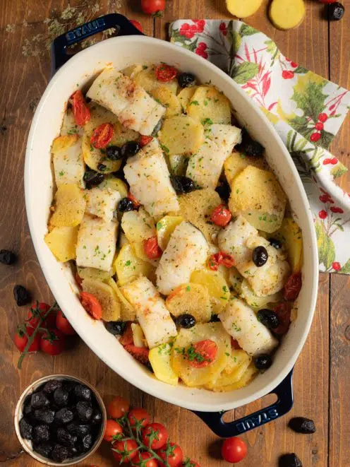 Un secondo piatto della tradizione mediterranea, semplice ma ricco di sapore: il baccalà al forno con patate è profumato con pomodorini, olive e aromi, perfetto per un pranzo in famiglia o una cena leggera ma gustosa.